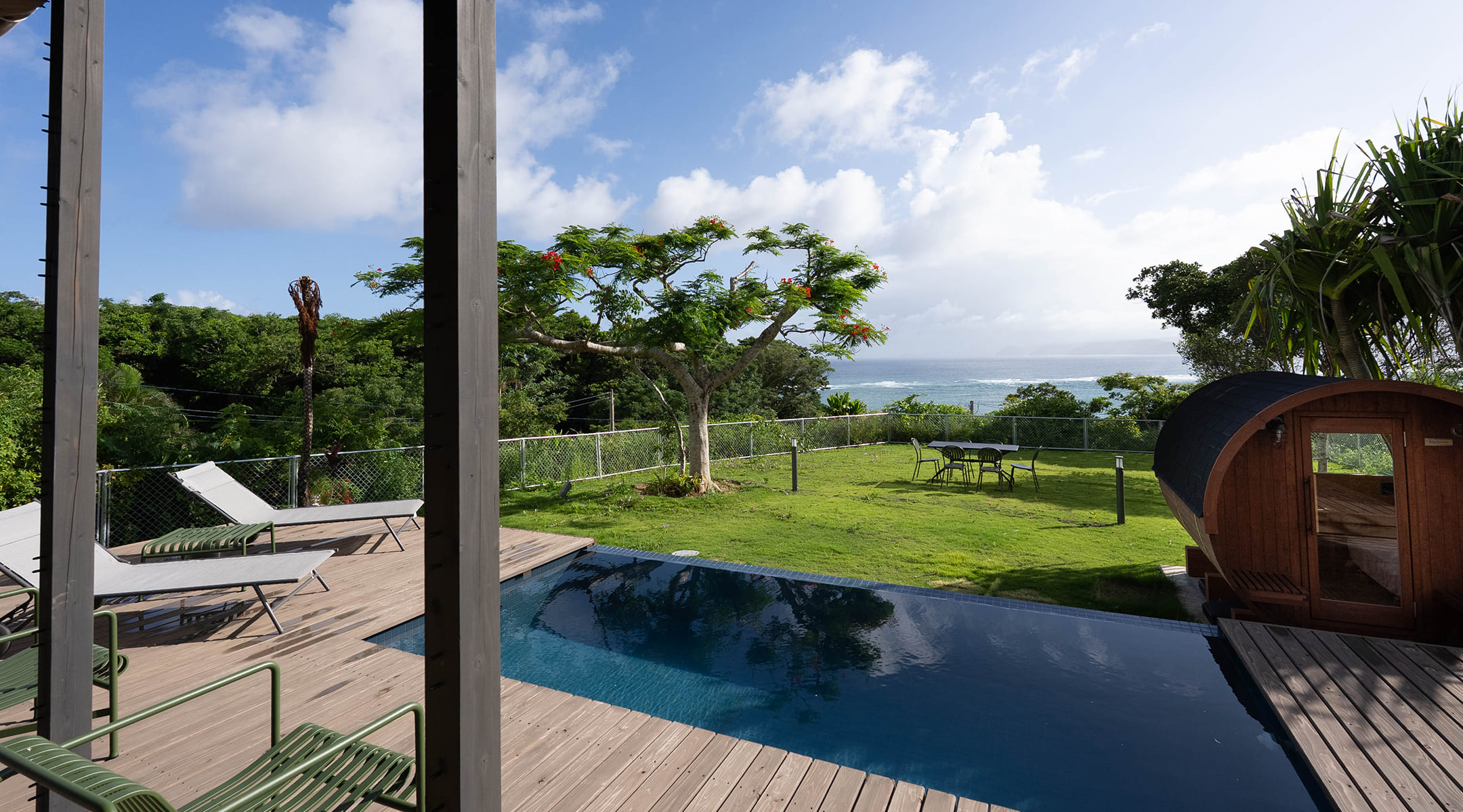 プライベートプールとウッドデッキで、海を一望しながら非日常の時間を過ごせます。
